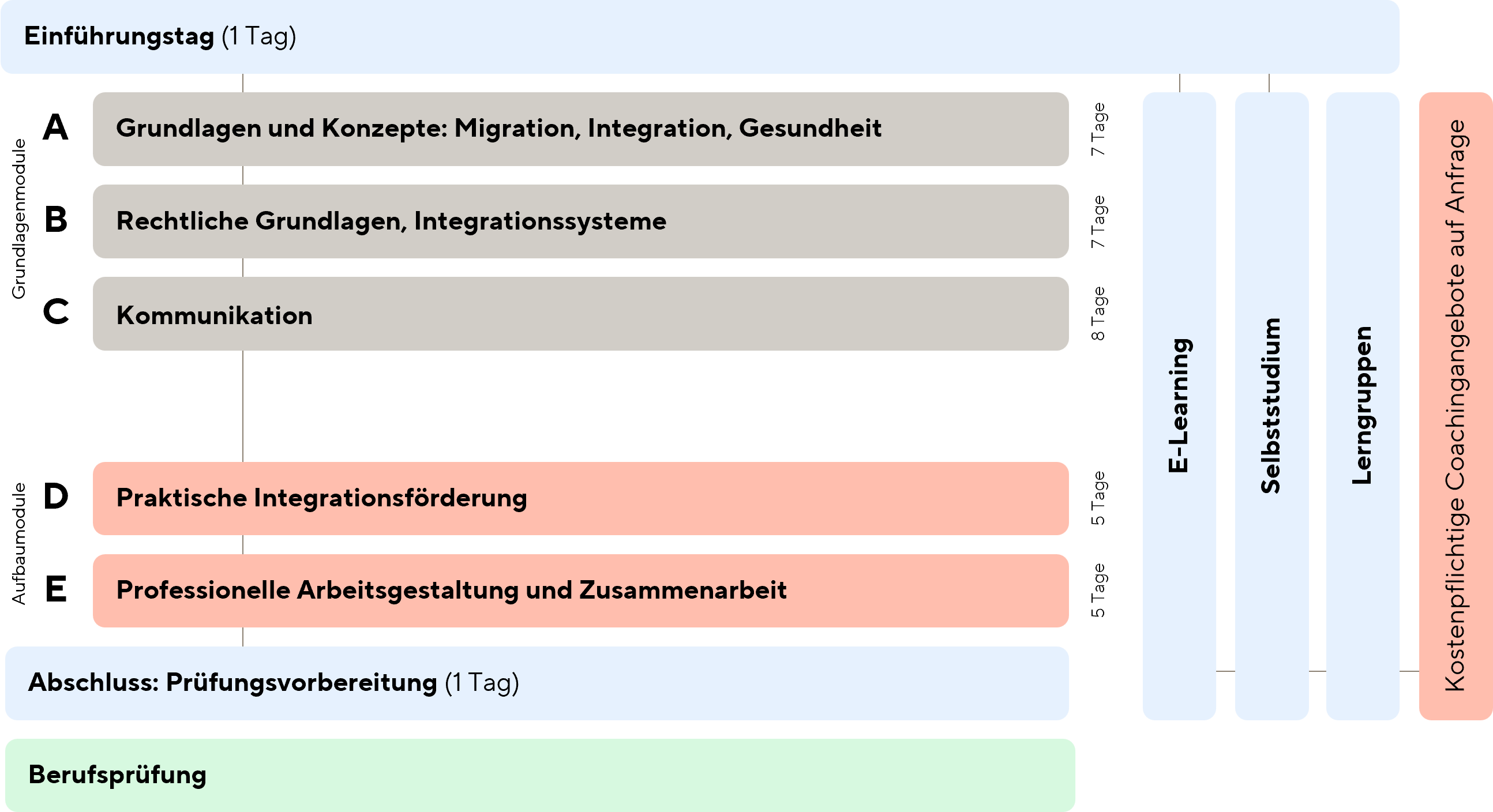 Der Vorbereitungslehrgang für Migrationsfachpersonen führt zur Berufsprüfung mit eidgenössischem Fachausweis. Er umfasst fünf Module, einen Einführungstag sowie zwei Prüfungsvorbereitungstage zum Abschluss.