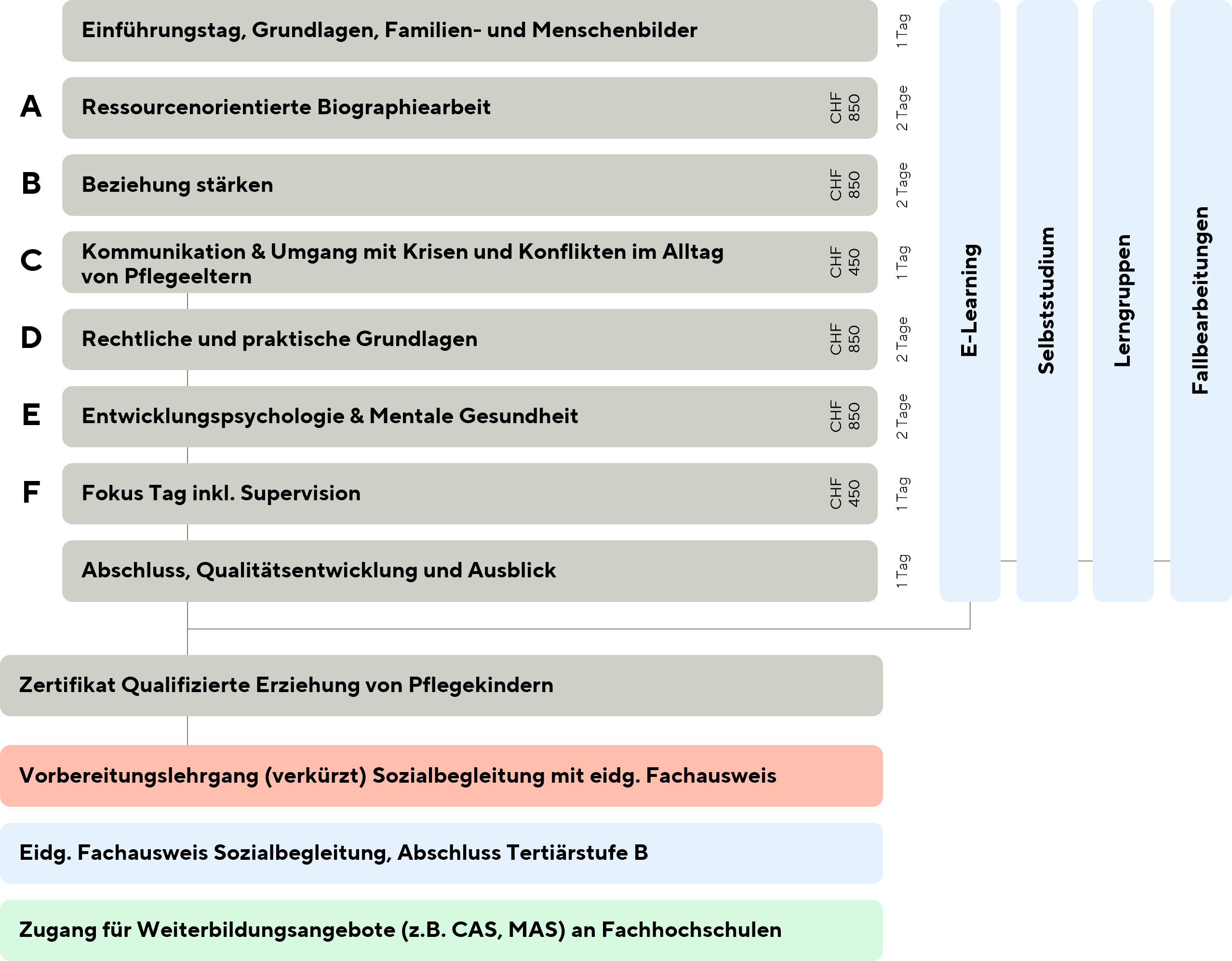 Der Lehrgang umfasst 12 Ausbildungstage, verteilt auf 6 Schwerpunktmodule und erstreckt sich über einen Zeitraum von 1.5 Jahren, da die Schulferien kantonal unterschiedlich sind und in der Planung so weit wie möglich berücksichtigt werden. Für Vor- und Nachbereitung der Kurstage, Lerngruppentreffen und E-Learning wird mit ca. 120 Stunden (ca. 6 Stunden pro Monat) für Selbststudium gerechnet.